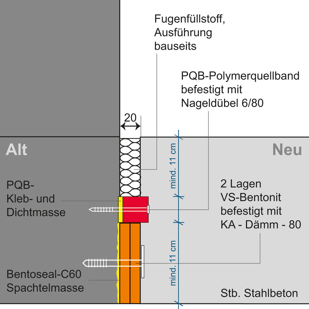 Das natürliche Natriumbentonit der VS-Bentonit-Streifen entwickelt bei Wasserzutritt einen injizierenden Quelldruck und dringt in die Schadstellen der umgebenen Oberflächen ein. Das oberhalb angeordnete formstabile PQB-Polymerquellband verhindert ein Austreten des Bentonits und hält das Material unter ständigem Quelldruck. Das System lässt eine Fugenbewegung von max. 50 % zu.